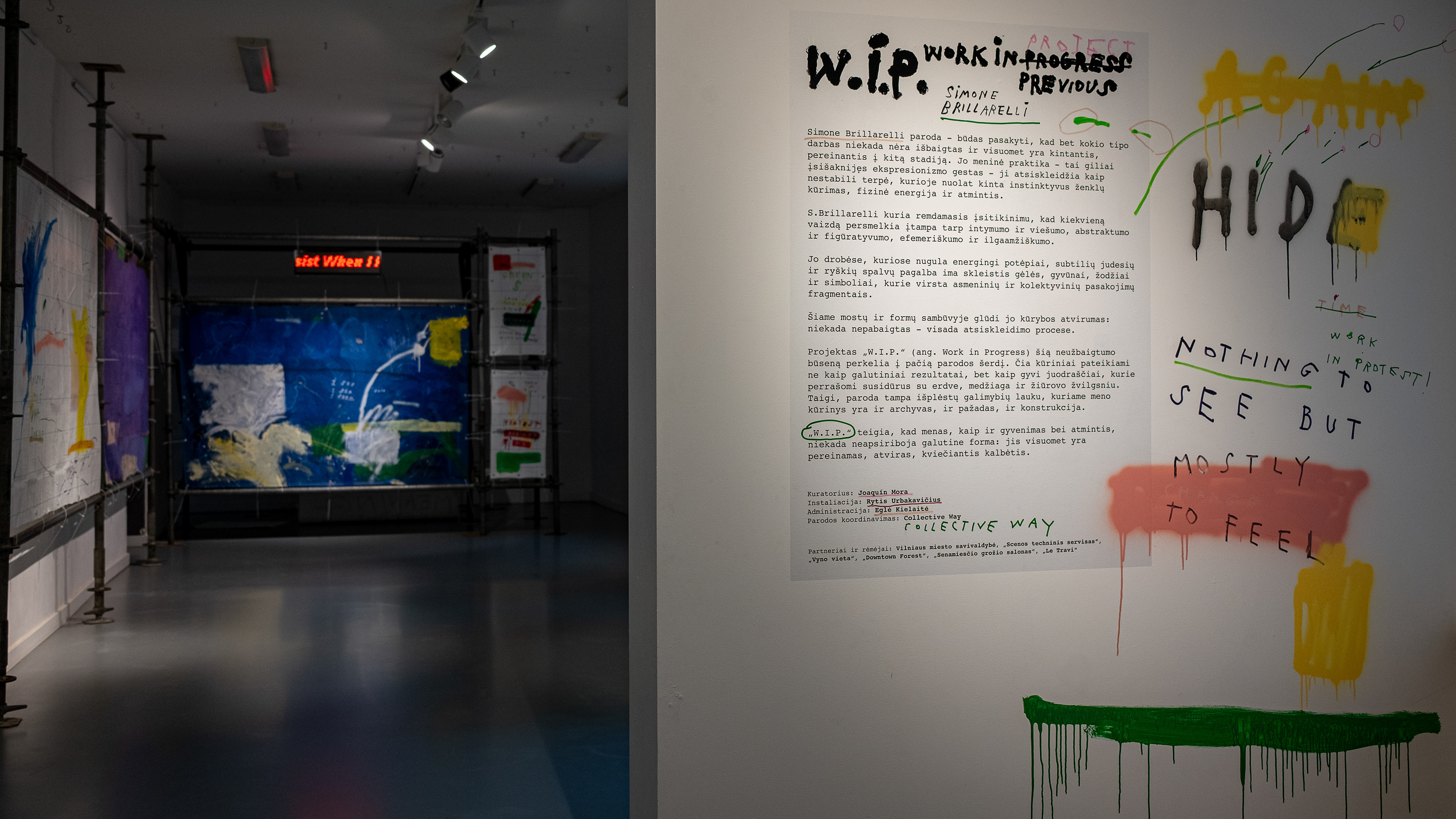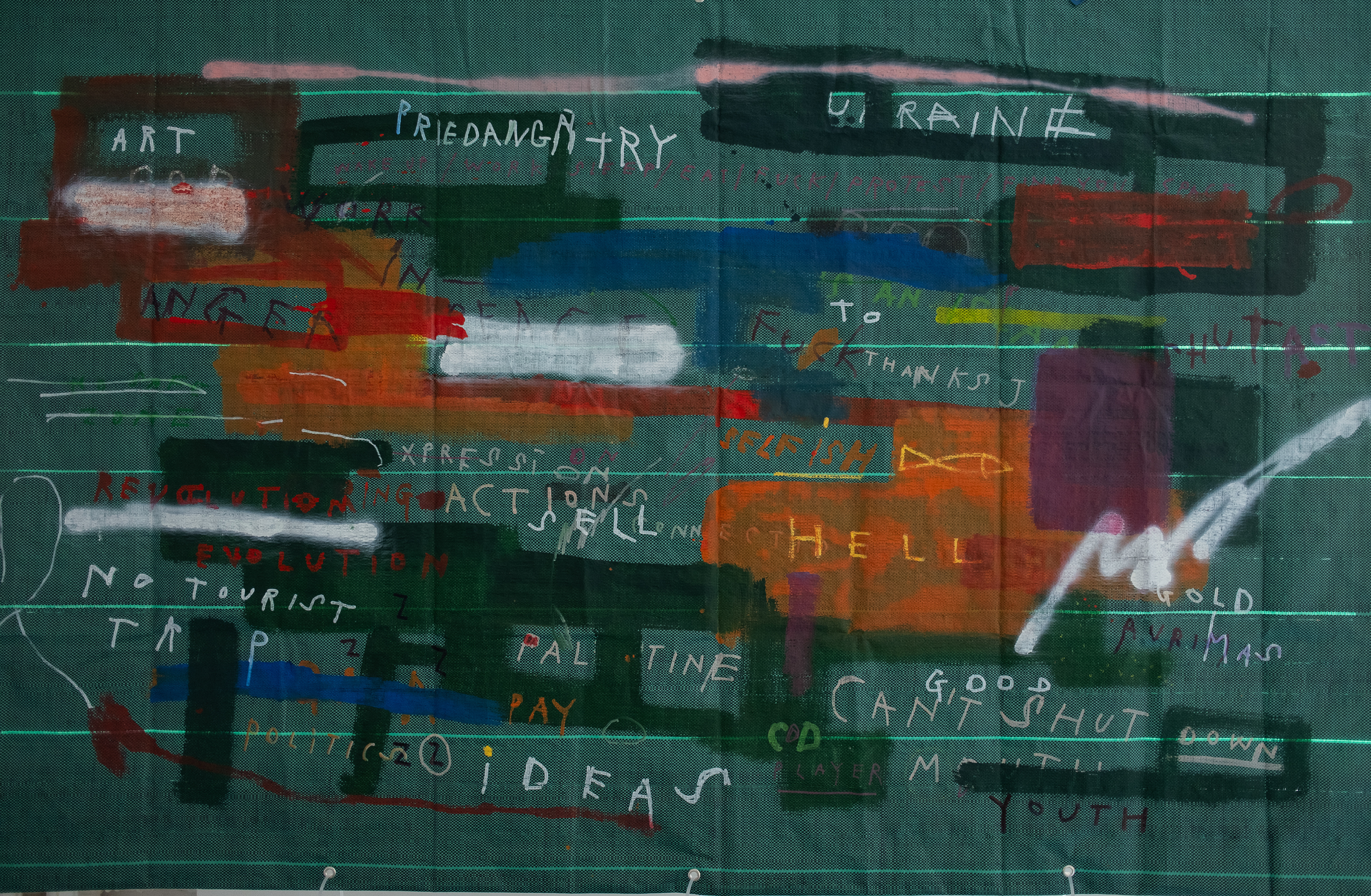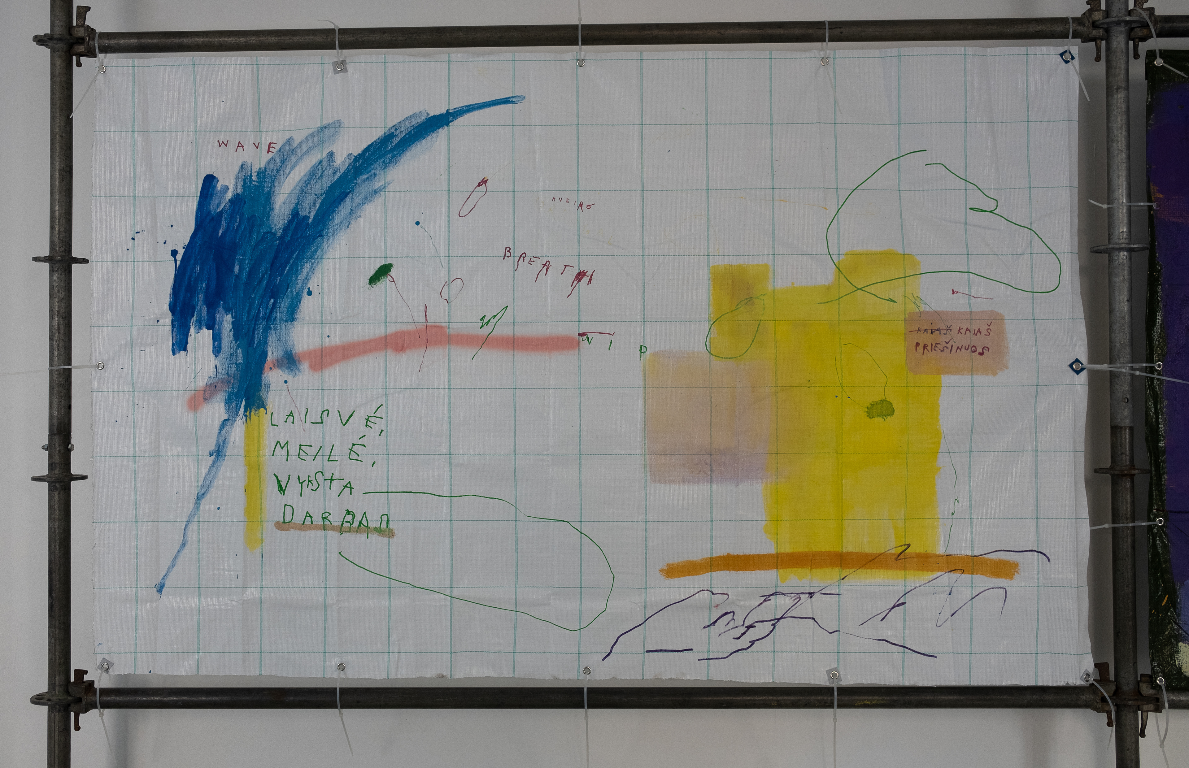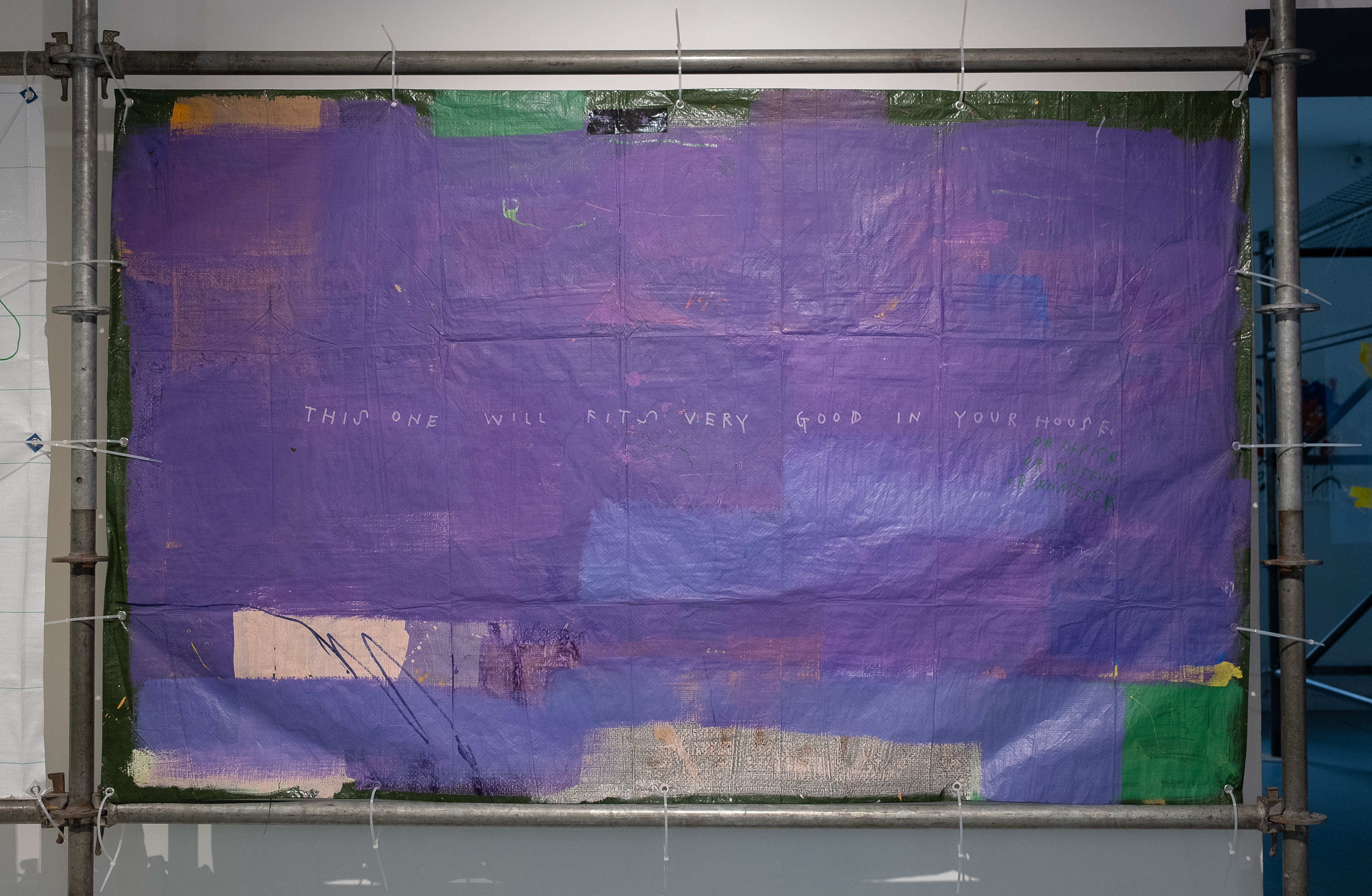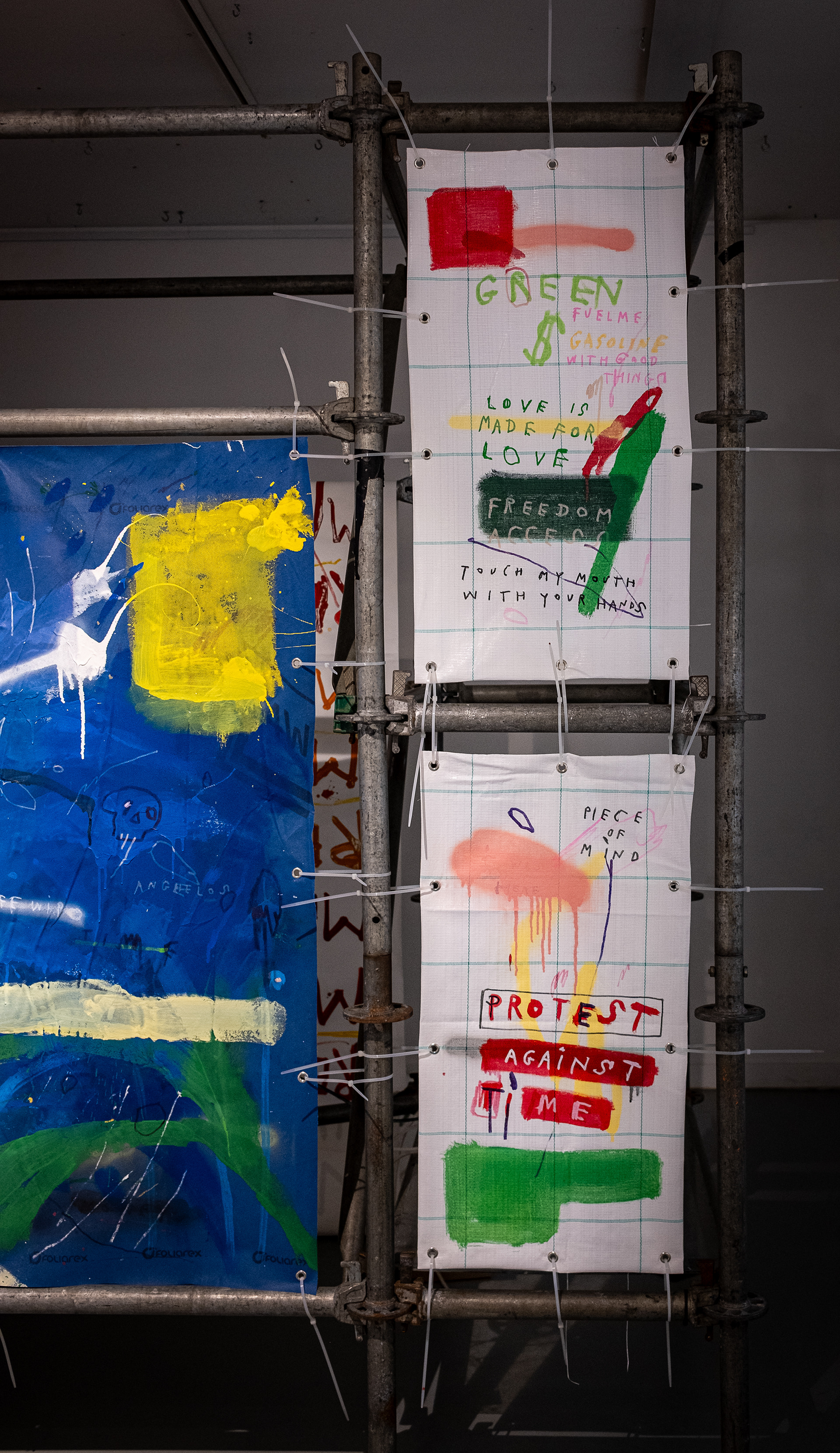 Large PVC sheets hang from the walls like protective tarps on a building site, painted with broad fields of color, multilingual writings, and casual marks, as if left by passersby on temporary surfaces.