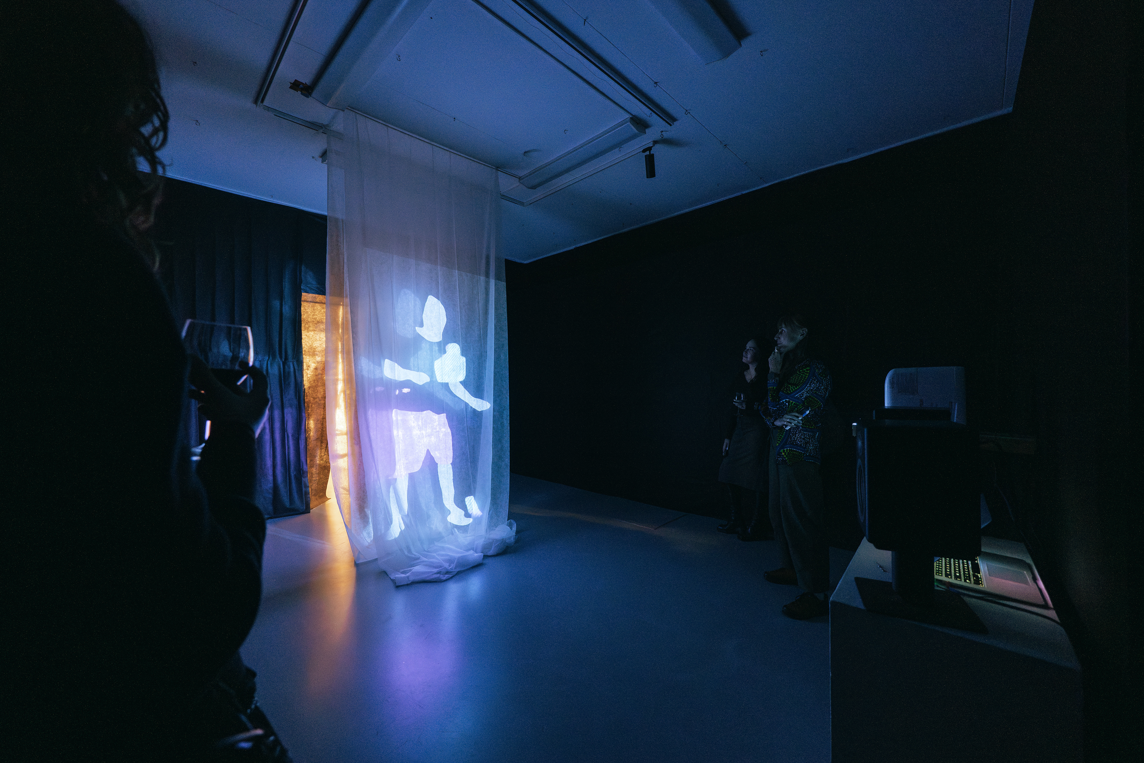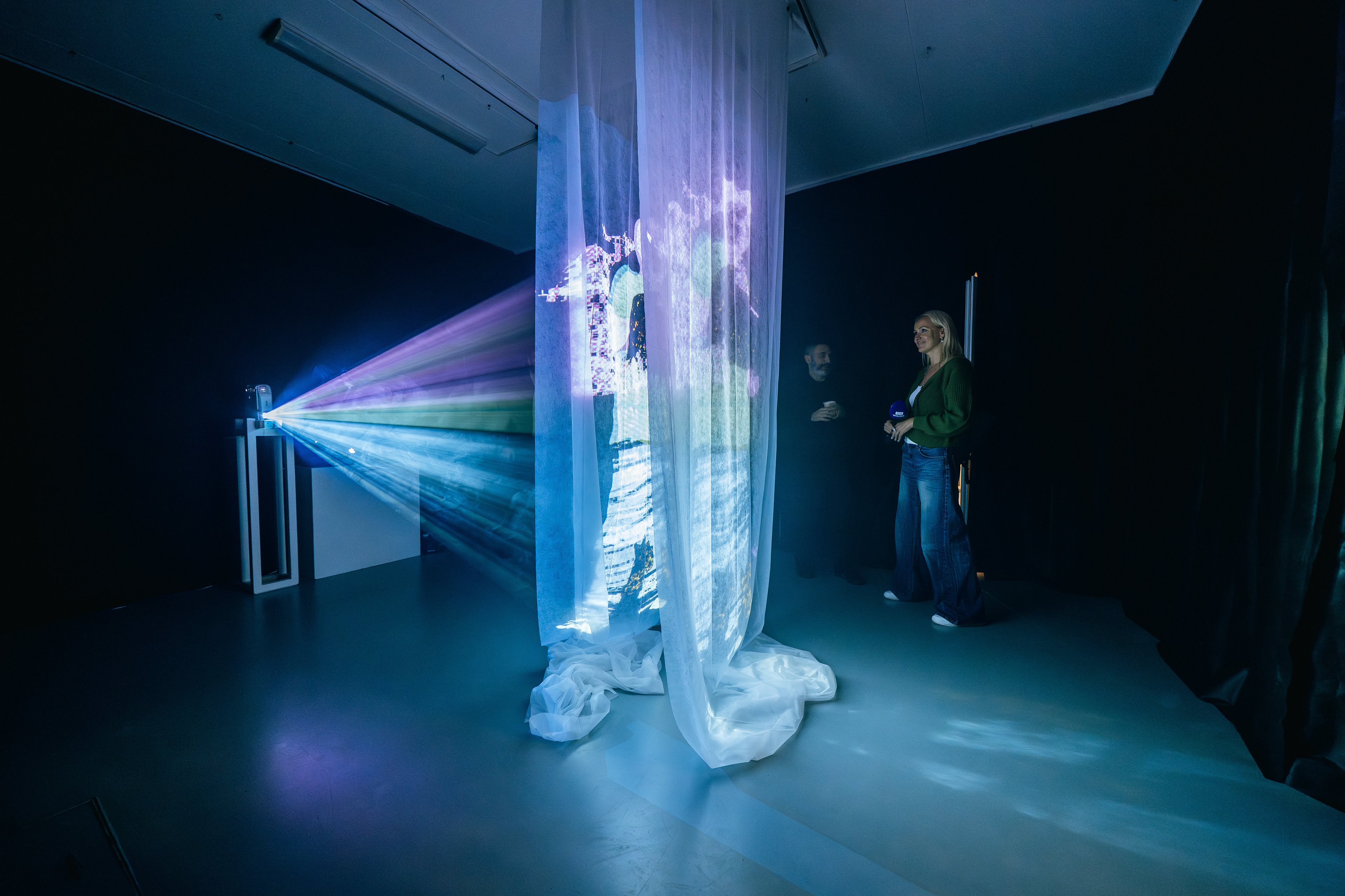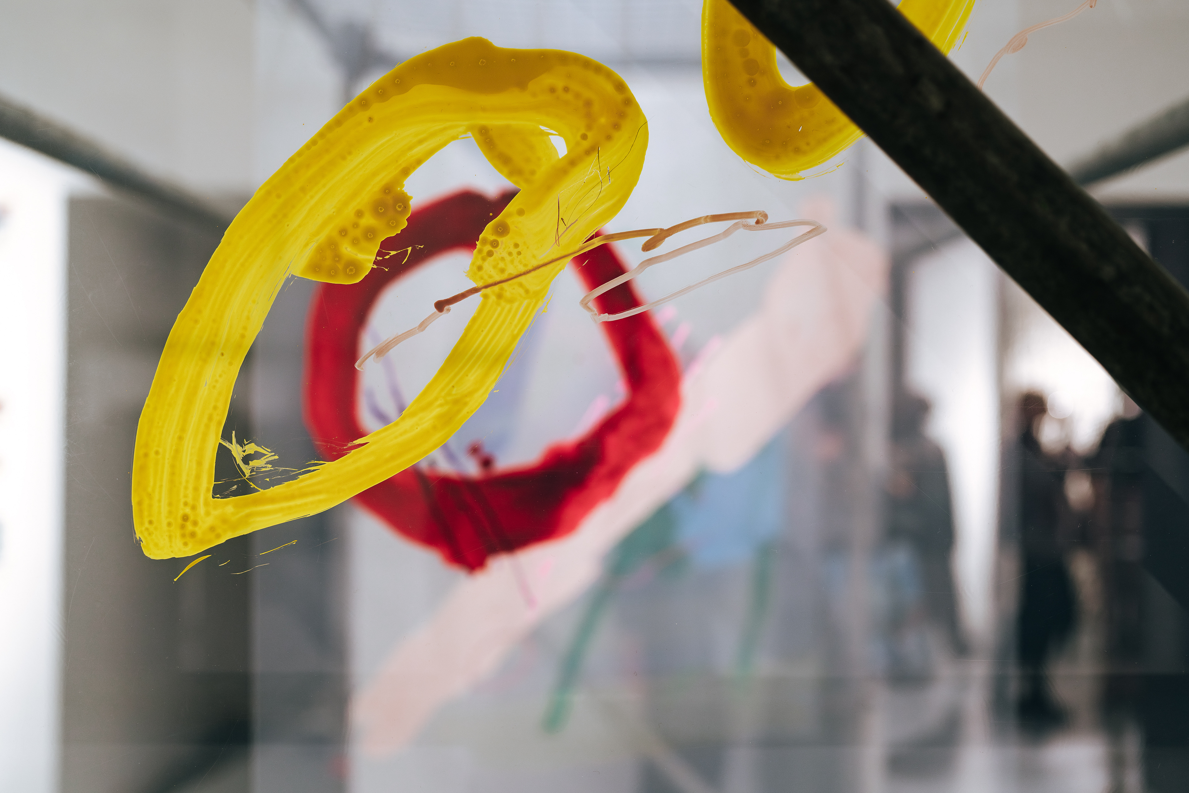 At its center stands an installation of painted transparent layers that form a complete image only when viewed from a precise angle.
