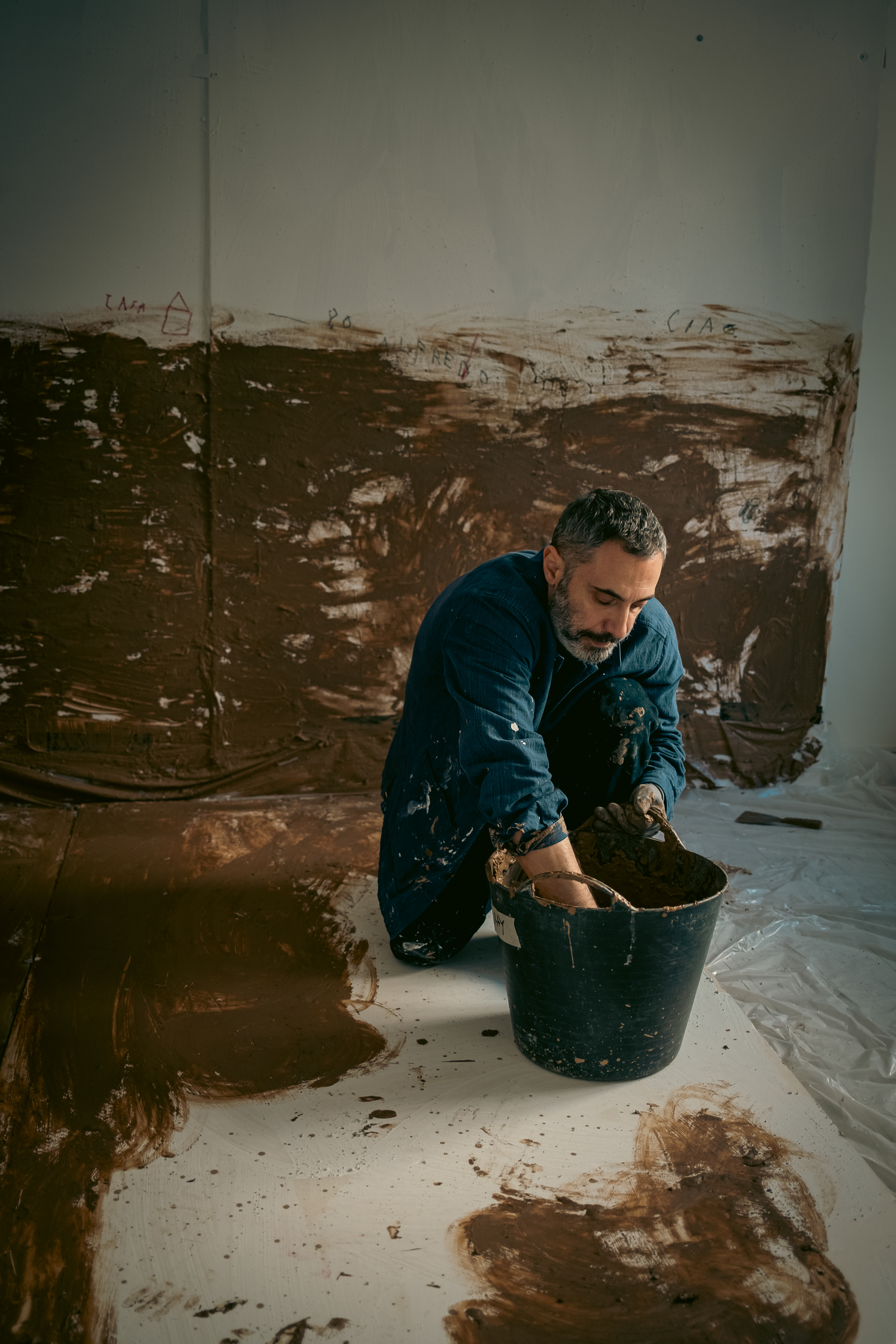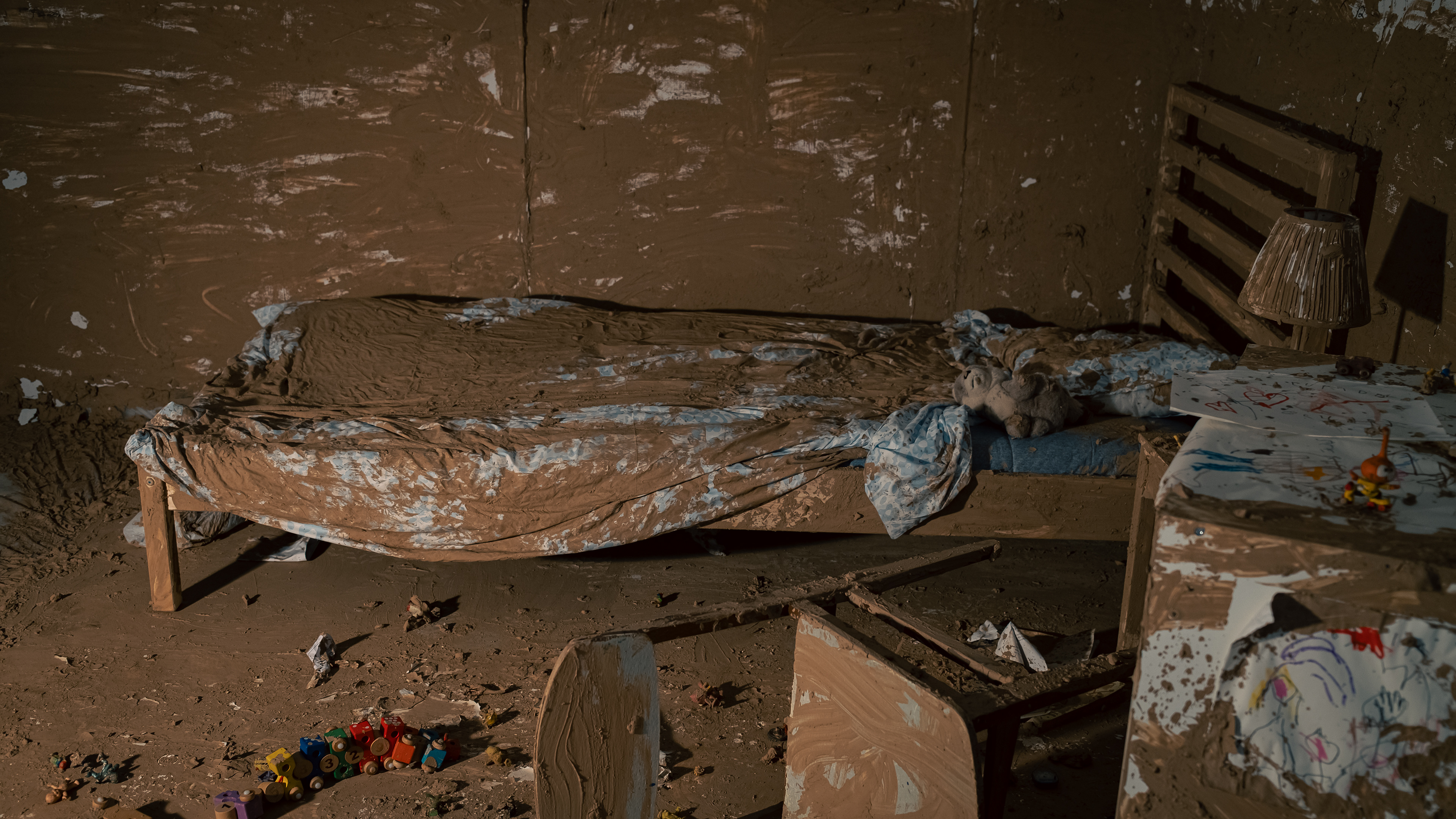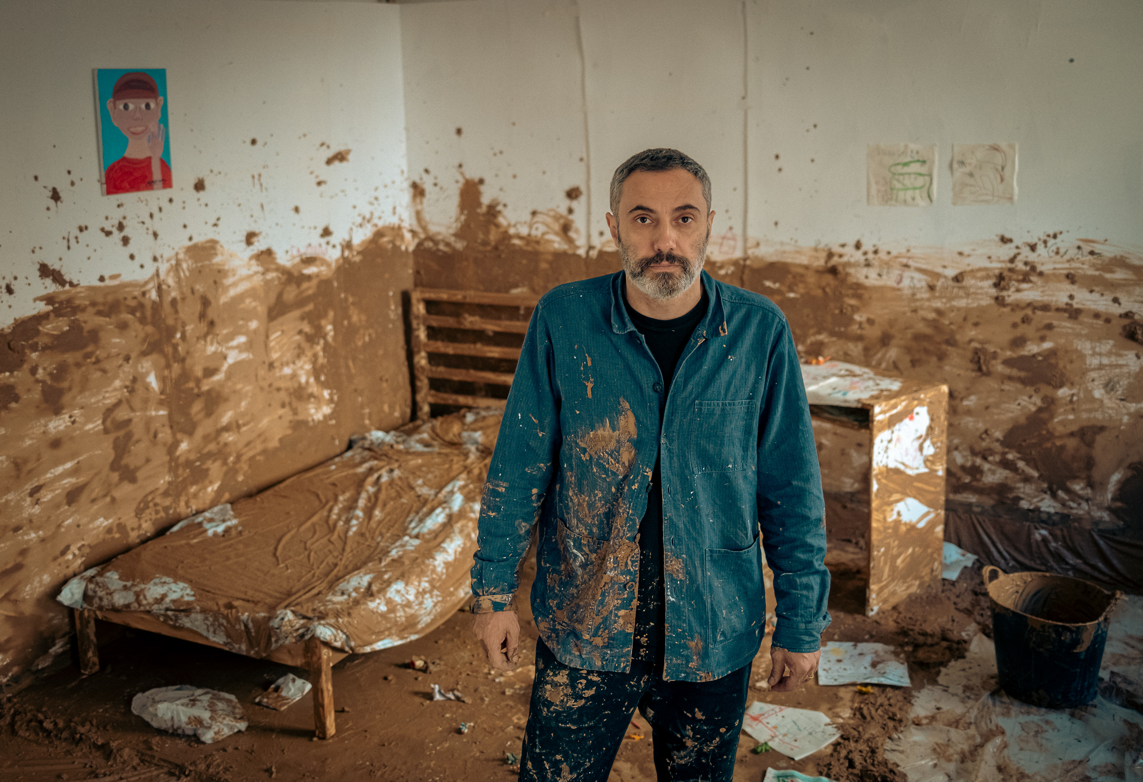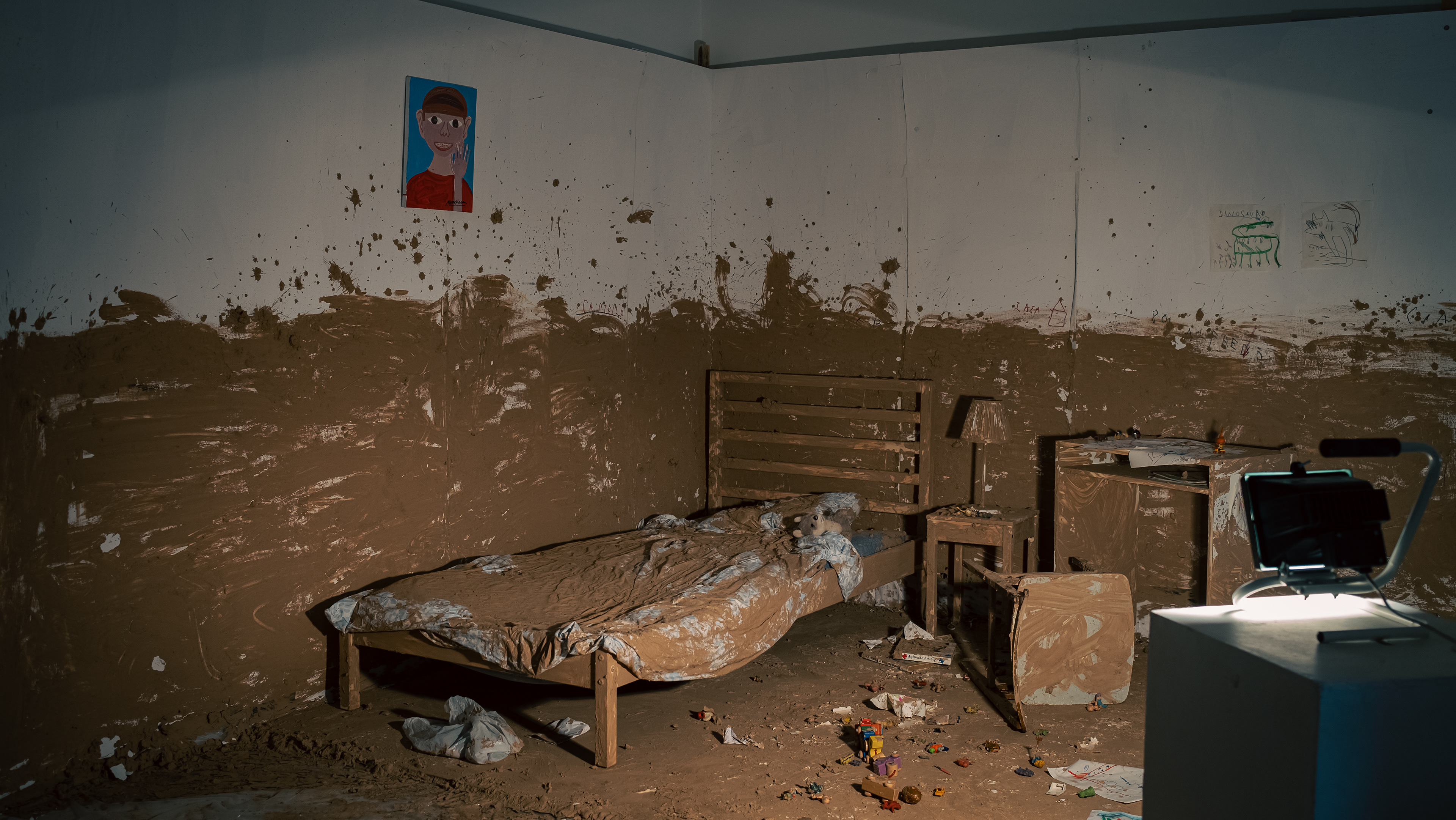 The final room is an intimate, autobiographical reconstruction: a domestic interior covered in mud.