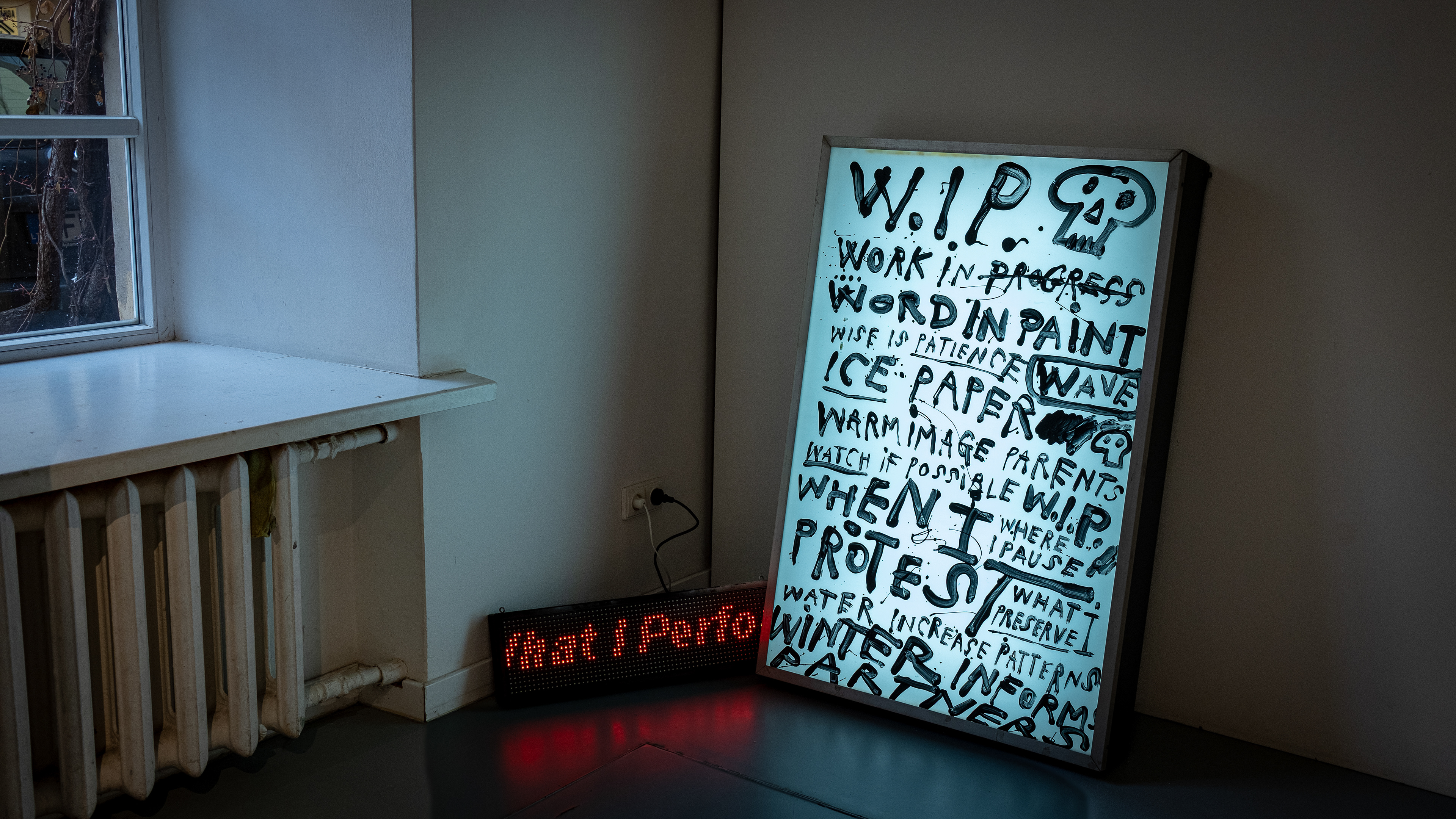Site specific installation: metal structures, pvc tarpaulin, cotton fabric, light box, led displays, acrylic paint, oil stick, graphite, pens