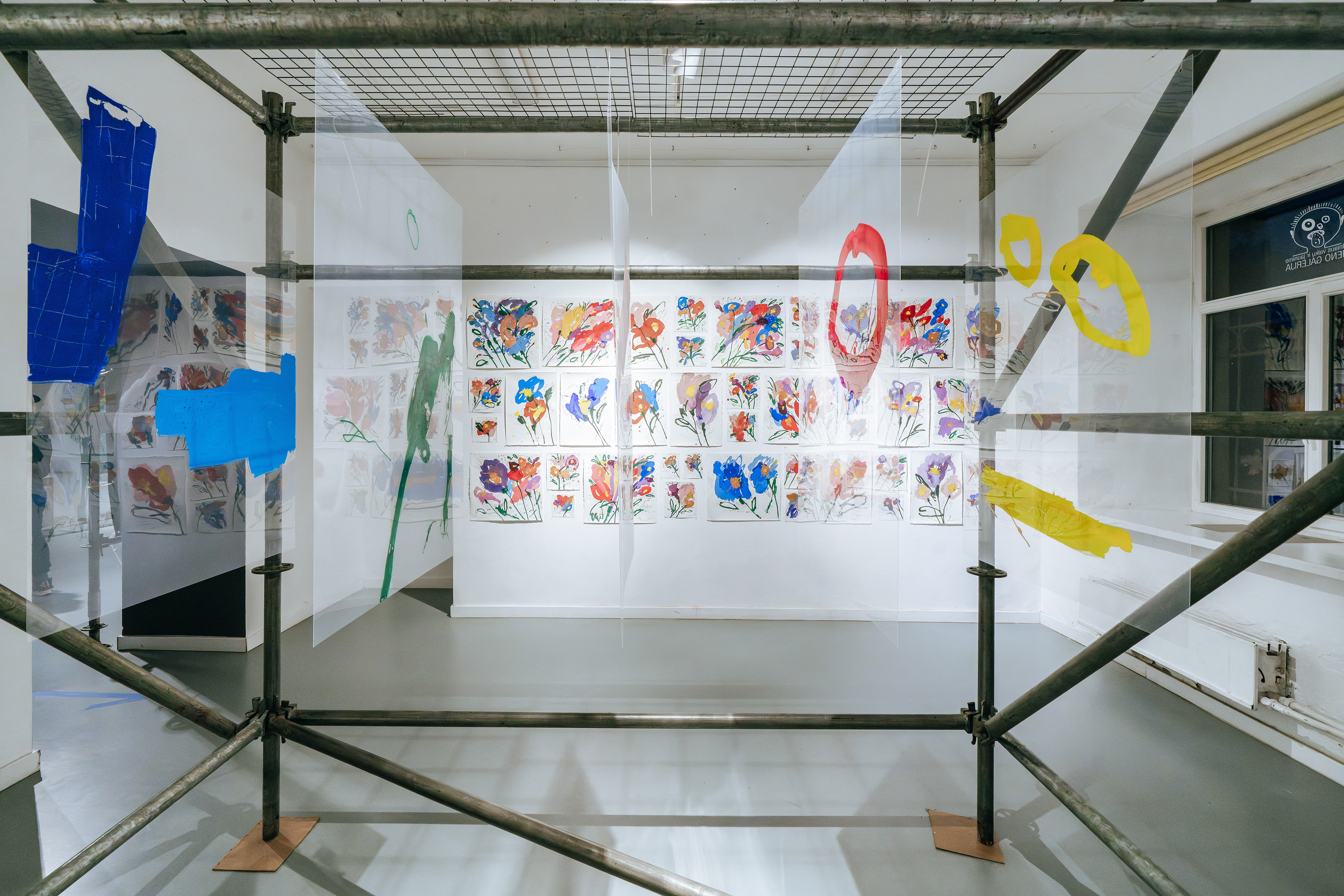 Site specific installation: metal structures, transparent pvc sheets, Amatruda cotton paper, acrylic paint, oil stick, graphite, pens